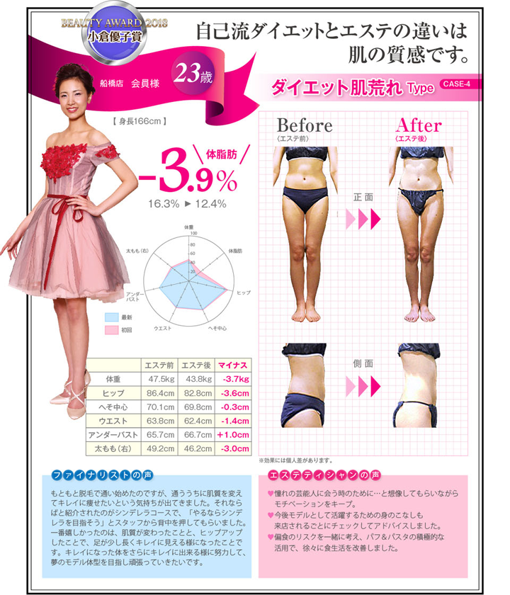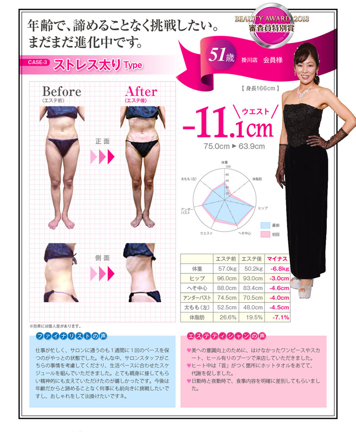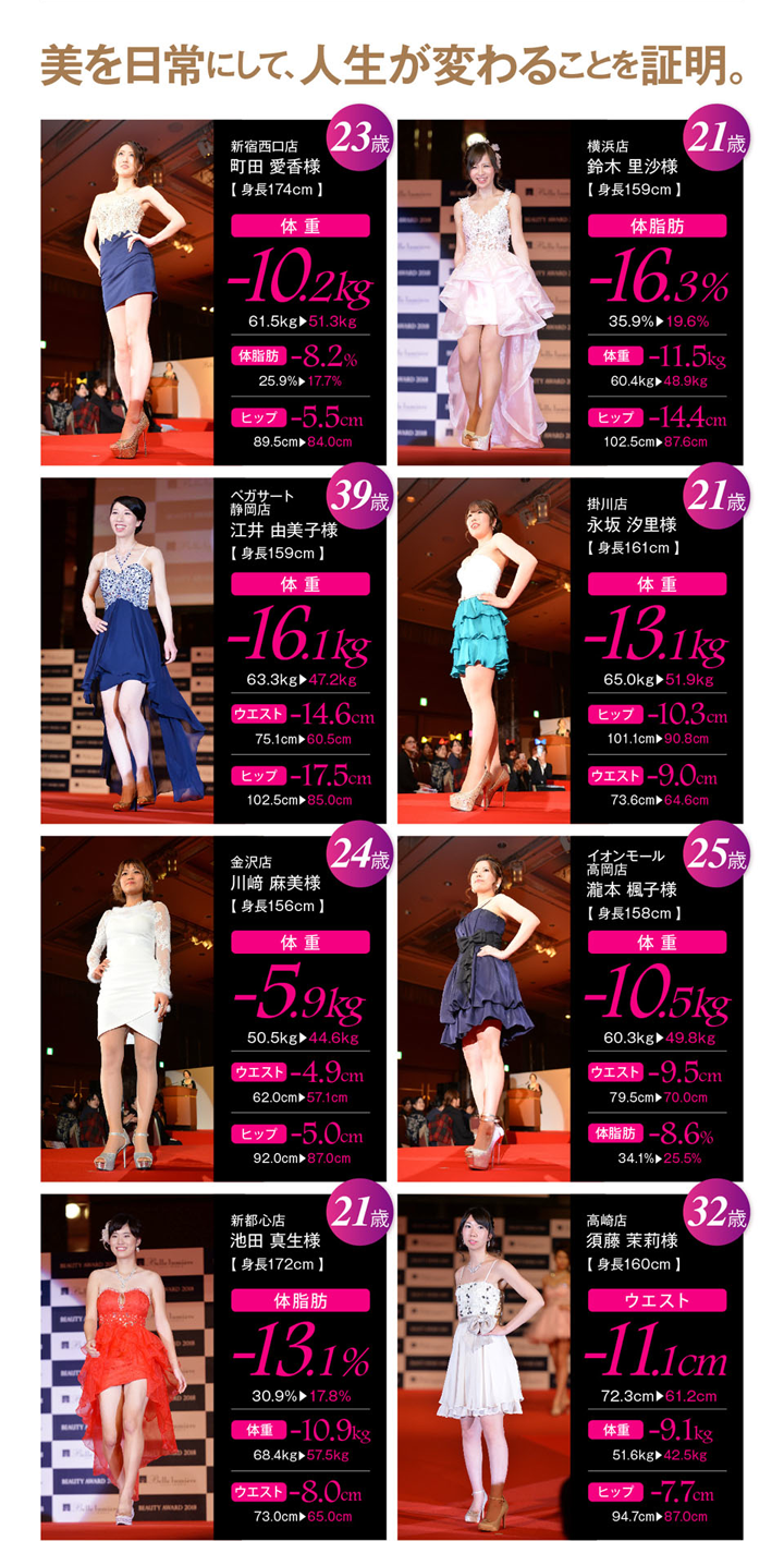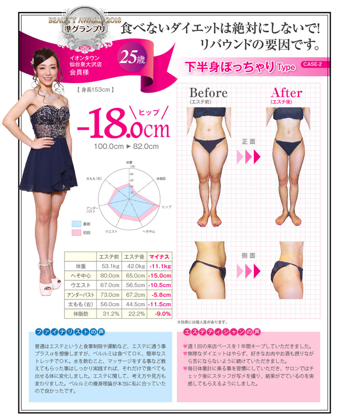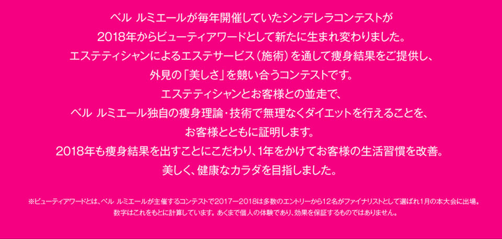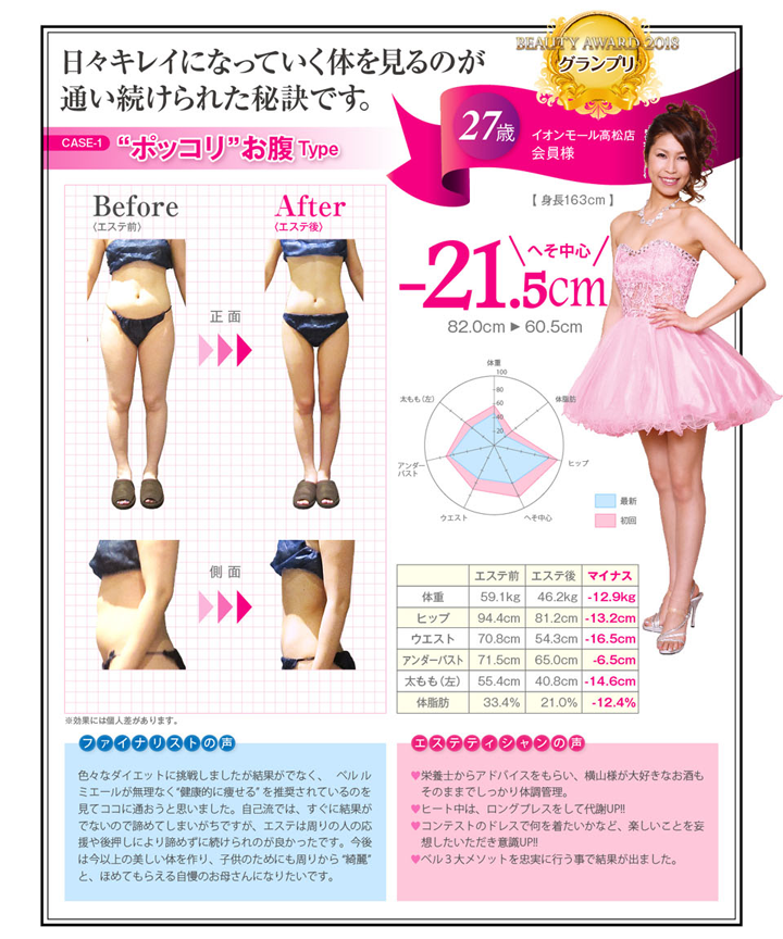 BeautyAward2018 ベル ルミエールが毎年開催していたシンデレラコンテストが2018年からビューティーアワードとして新たに生まれ変わりました。 BeautyAward2018 結果発表 20代~50代までの幅広い年齢層から結果が出ています。 ポッコリお腹Type 下半身ぽっちゃりType