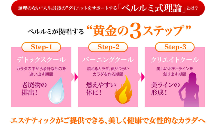 無理のない人生最後のダイエットをサポートするベルルミ理論とは? 専属栄養士による食事サポート 遺伝子レベルで太る原因を徹底解剖 豊富なホームケアアイテムによるサポート 貴女だけのオリジナルダイエットプログラムで貴方だけのダイエットプランをご提供 ストレス太りType ダイエット肌荒れType 美を日常にして、人生が変わることを証明。