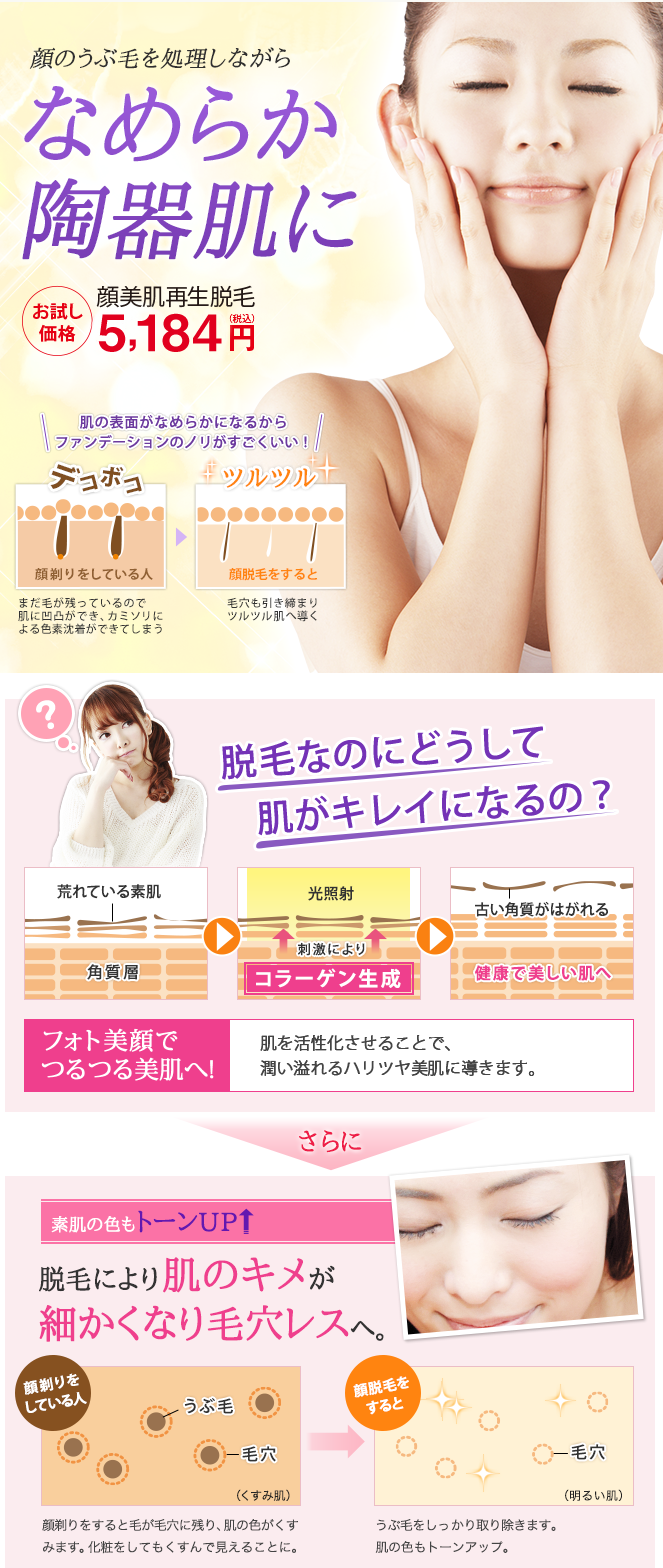 脱毛なのに、肌がまるで陶器のようになめらかになります。光を照射してコラーゲンを生成するので美しい肌になり、化粧のノリも変わります。 顔脱毛することで、肌を活性化させ、毛穴も引き締まり肌の表面がなめらかになるので、化粧ノリが格段によくなります。