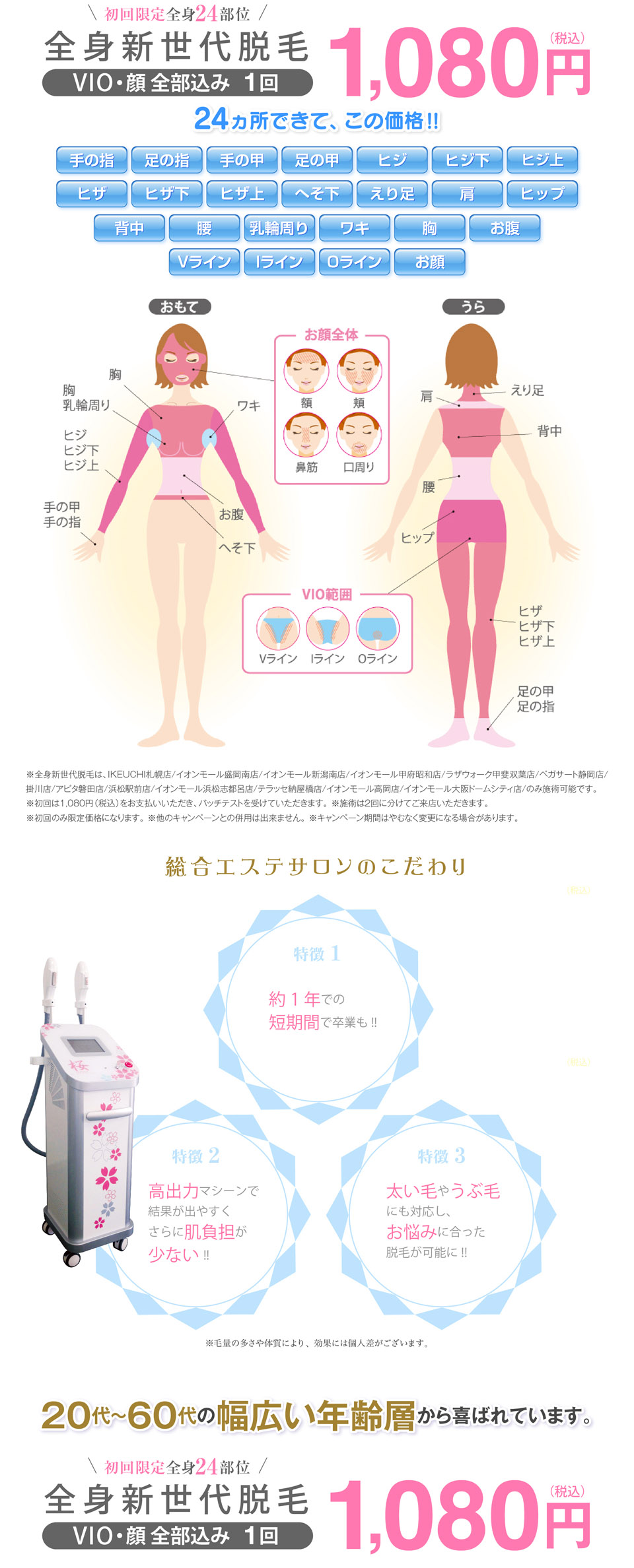 えり足・肩・ヒップ・背中・腰・乳輪周り・ワキ・胸・お腹・Vライン・Iライン・Oライン・お顔