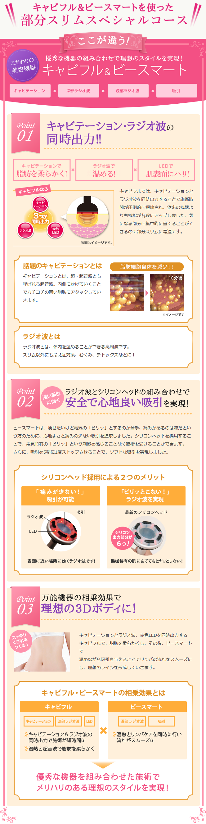 キャビテーションとラジオ波の同時出力で脂肪にアタック!1部位10分〜20分での施術を行っていきます。